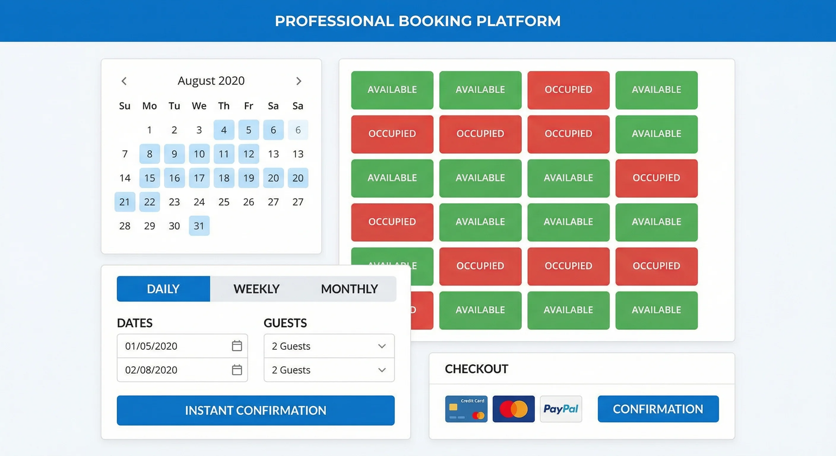 Customer self-service booking portal with real-time availability, instant confirmations, and flexible pricing. Manage daily, weekly, monthly, and long-term reservations seamlessly.