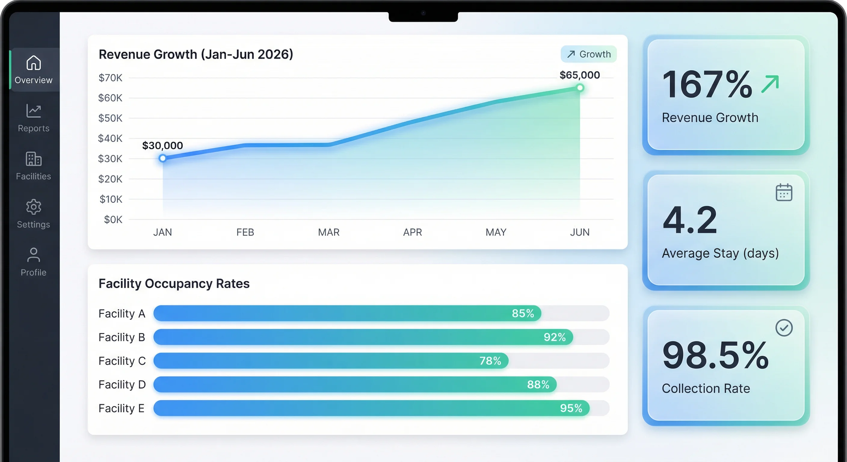 See daily revenue trends, forecast future earnings, and compare performance across facilities. Identify top performers and underutilized spaces instantly.