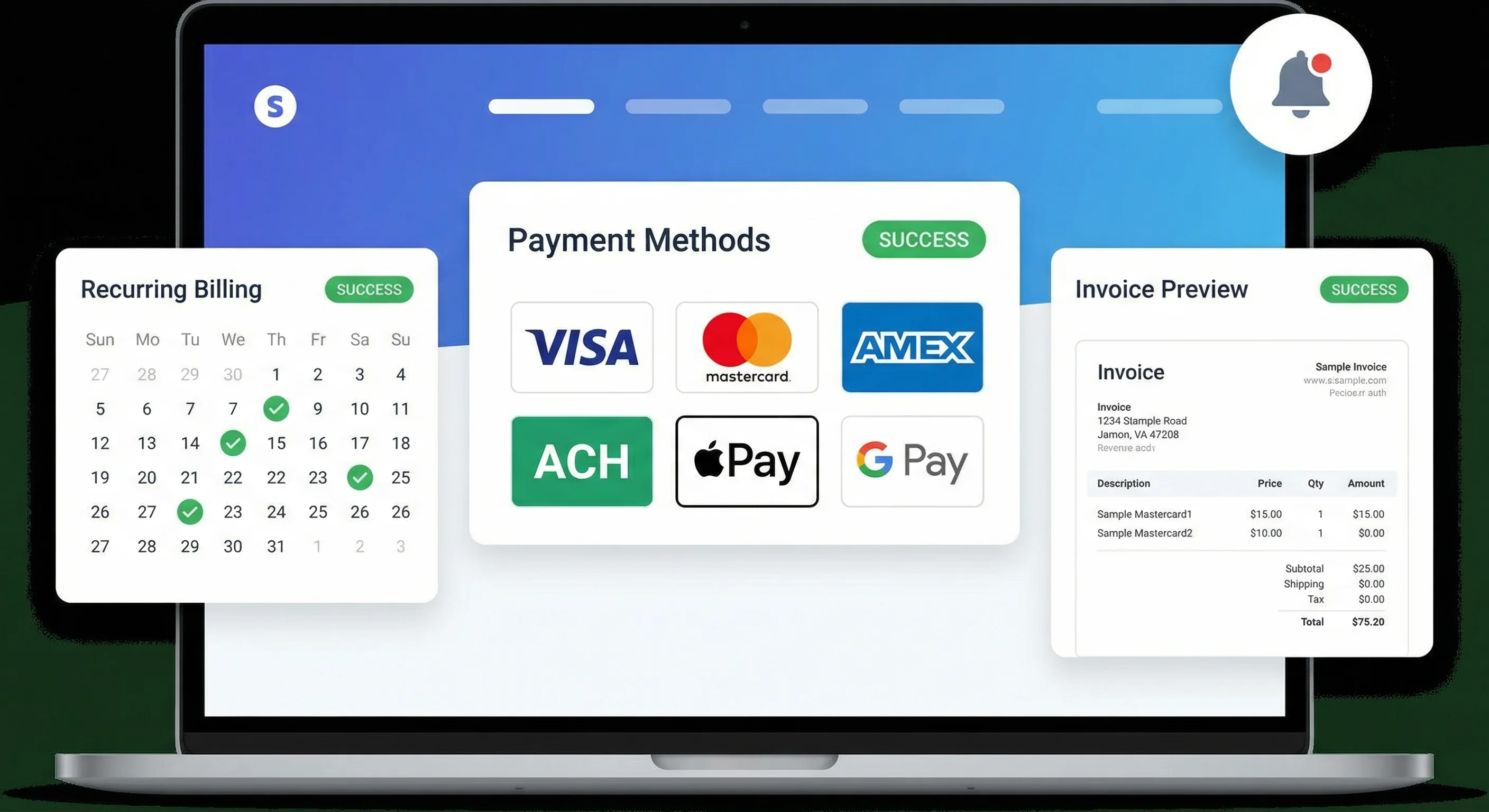 Accept all payment methods - credit cards, ACH, Apple Pay, and Google Pay. Automated recurring billing, invoice generation, and payment reminders with zero manual intervention.